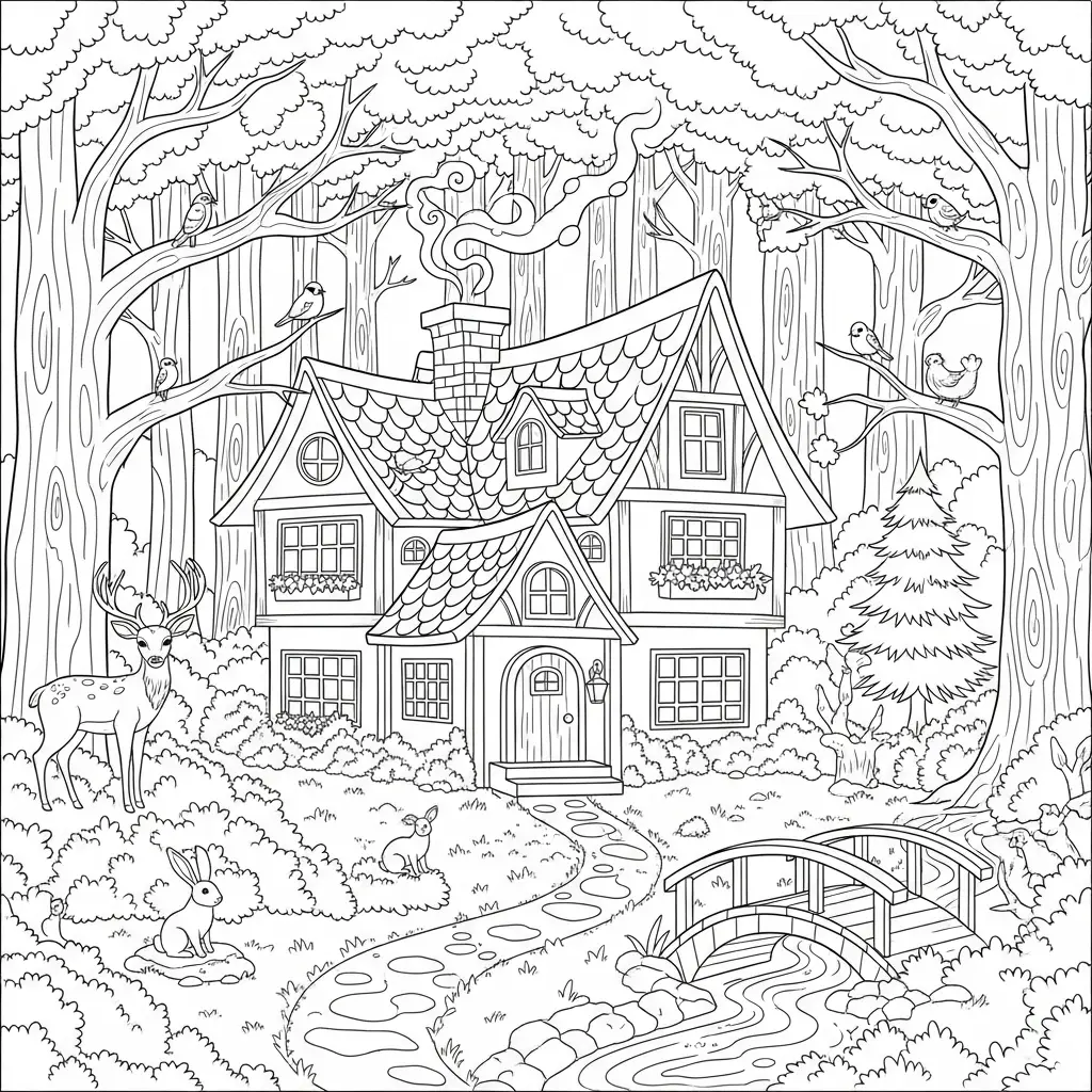 Desenho de uma casa na floresta para colorir