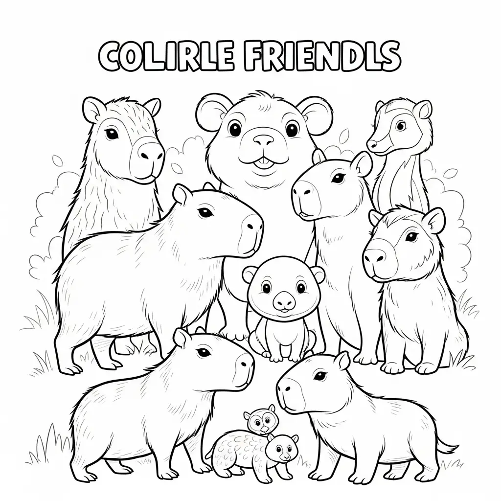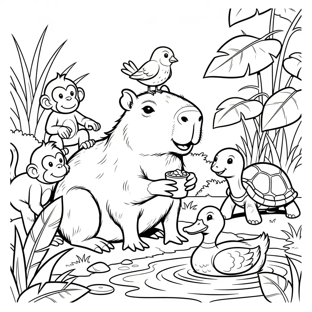 Desenho de Capivara fazendo amigos com outros animais para colorir