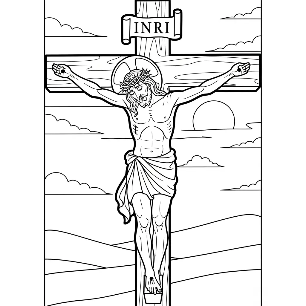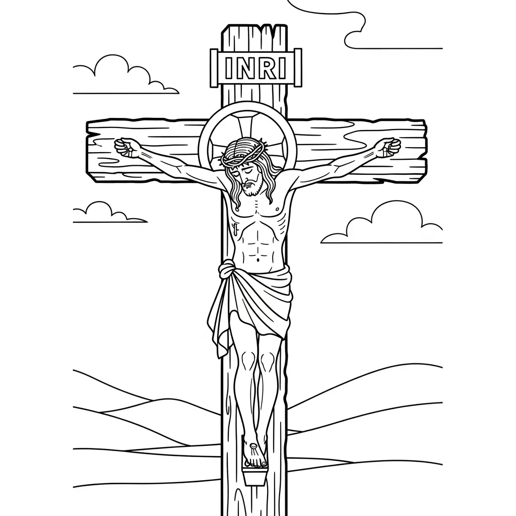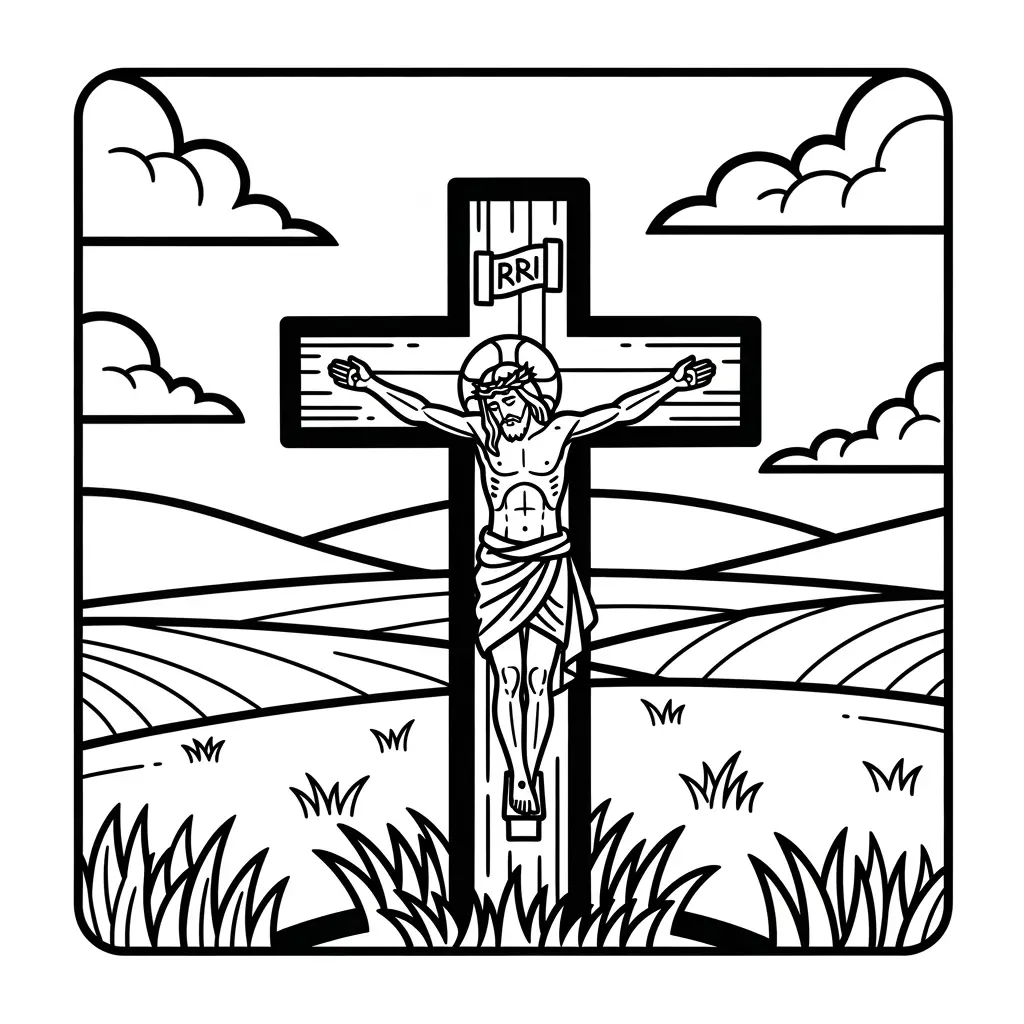 Desenho de Jesus e a cruz em um campo para colorir