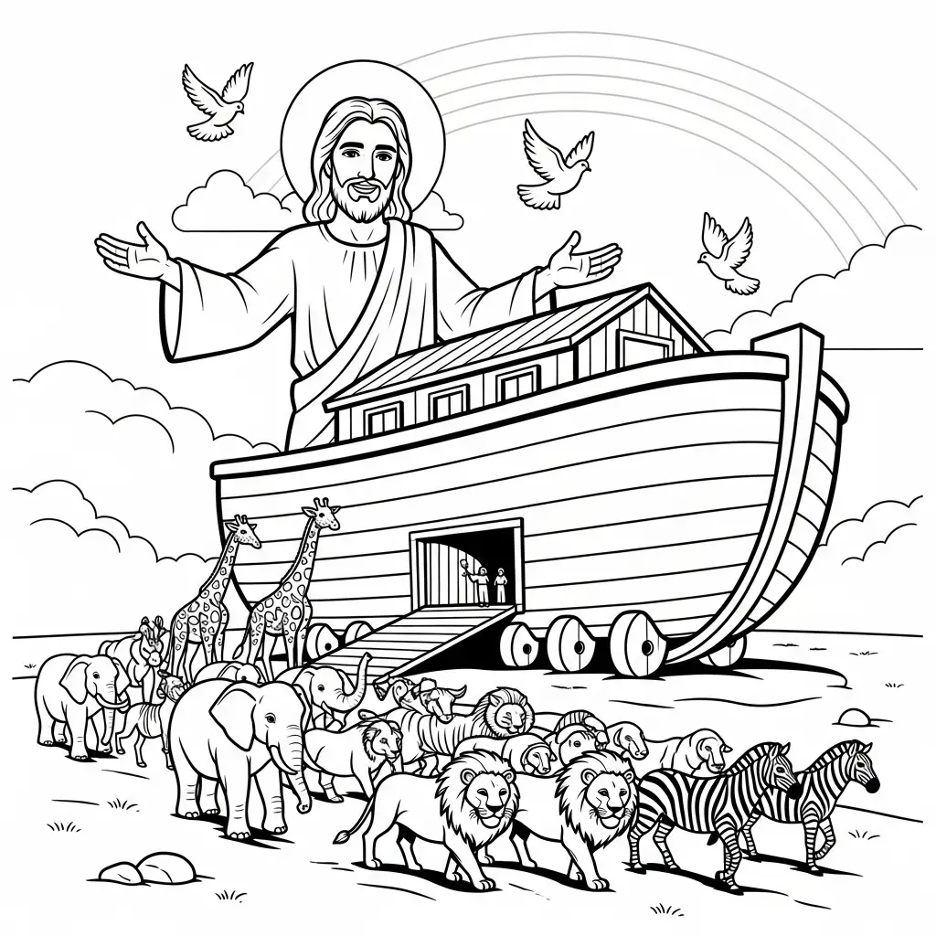 Desenho de Jesus e a arca de Noé para colorir