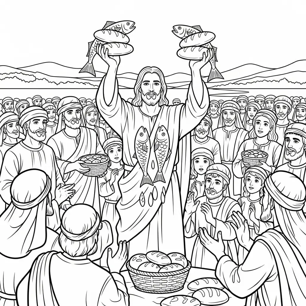 Desenho de Jesus e a multiplicação dos pães para colorir