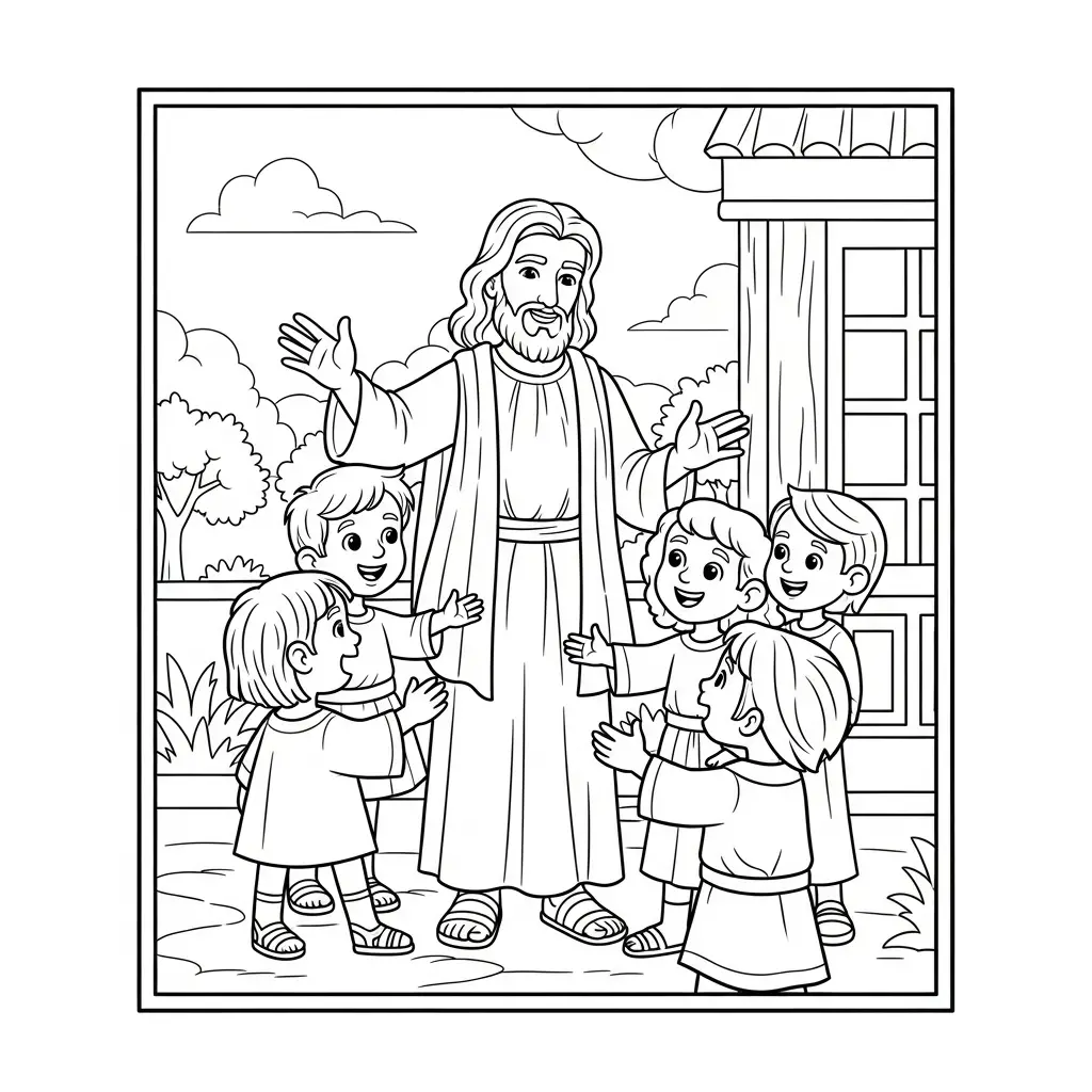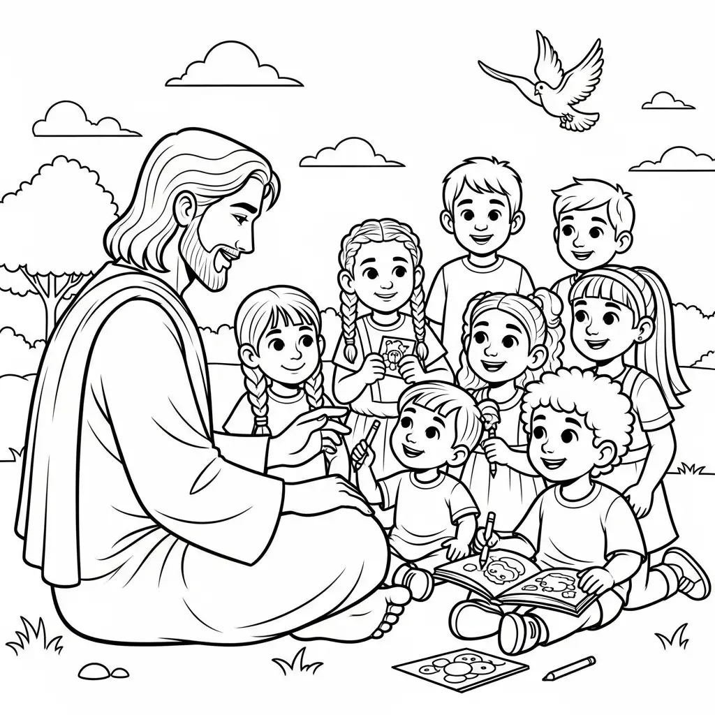 Desenho de Jesus e as crianças brincando para colorir