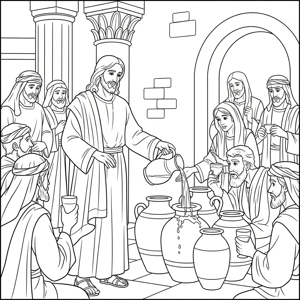 Desenho de Jesus e o milagre da água em vinho para colorir