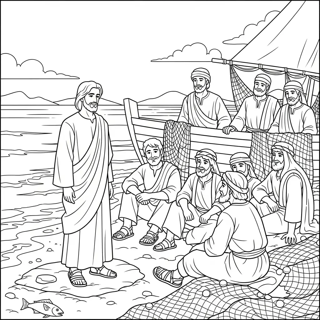 Desenho de Jesus e os pescadores para colorir