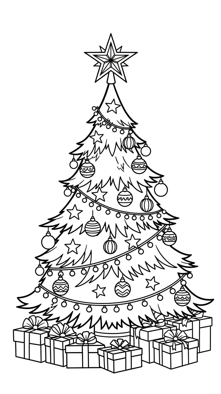 Desenho de árvore de Natal com presentes para colorir