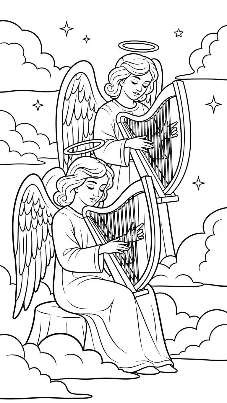 Desenho de anjos tocando harpas para colorir