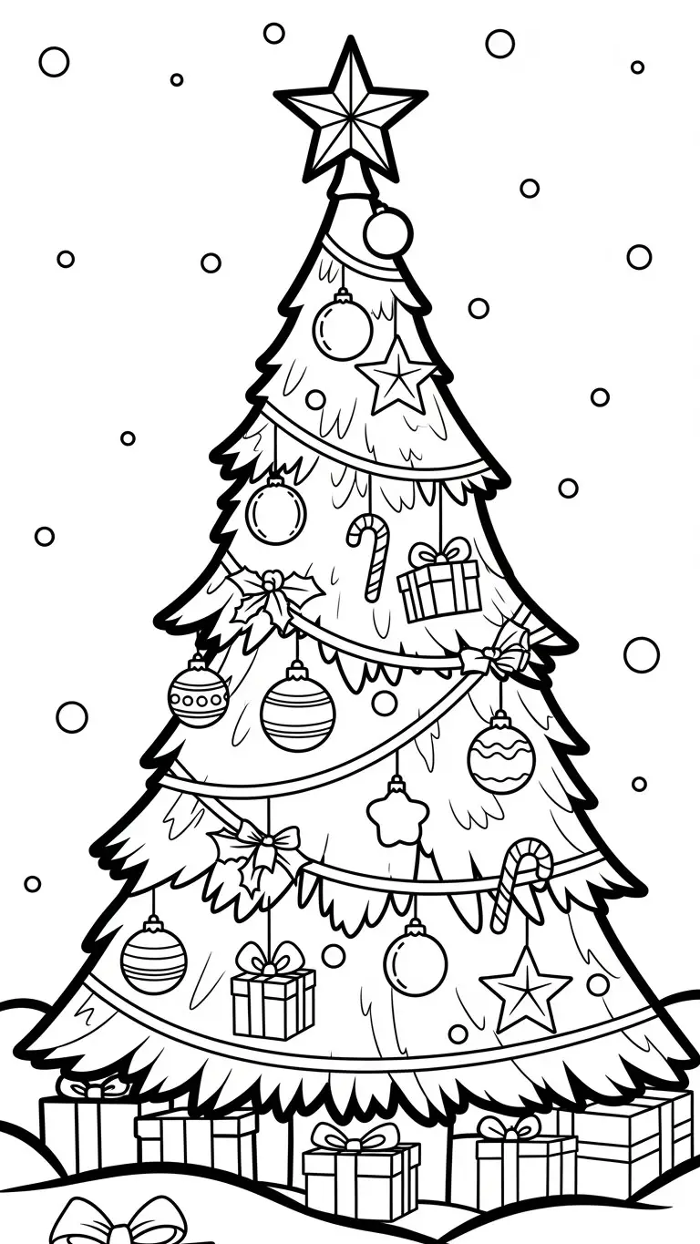 Desenho de árvore de Natal cheia de enfeites para colorir