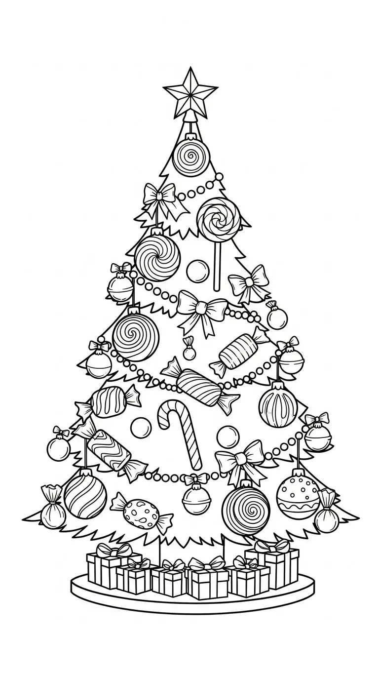 Desenho de árvore de Natal com enfeites de doces para colorir
