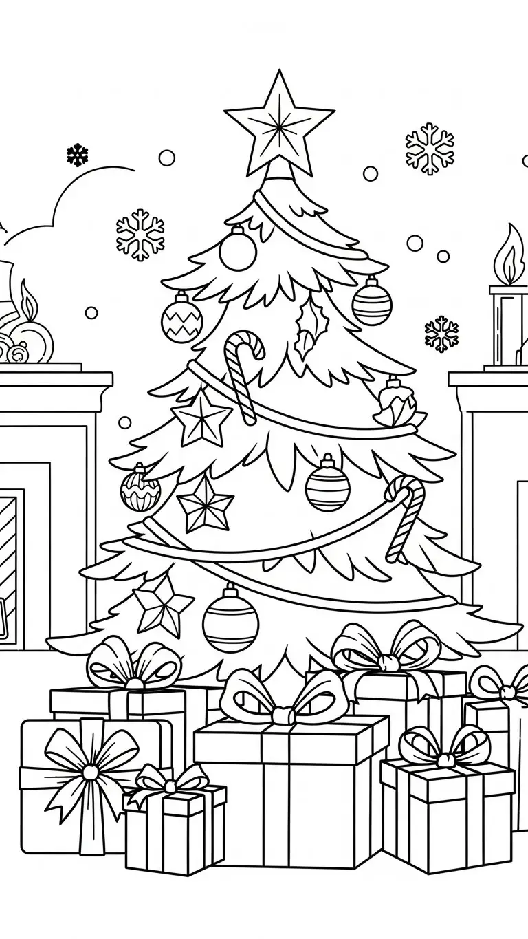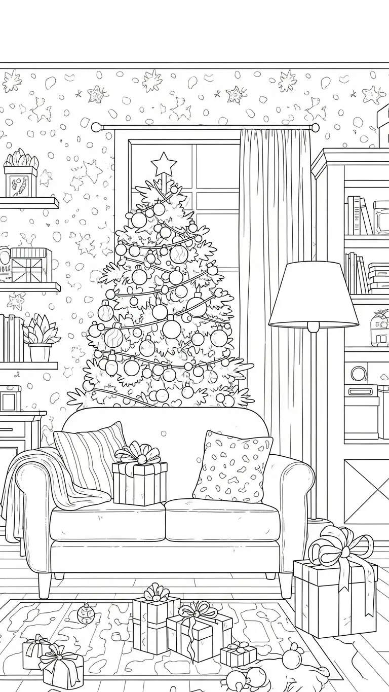 Desenho de decoração de Natal na sala para colorir