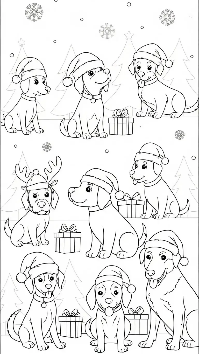 Desenho de cachorros com chapéus de Natal para colorir