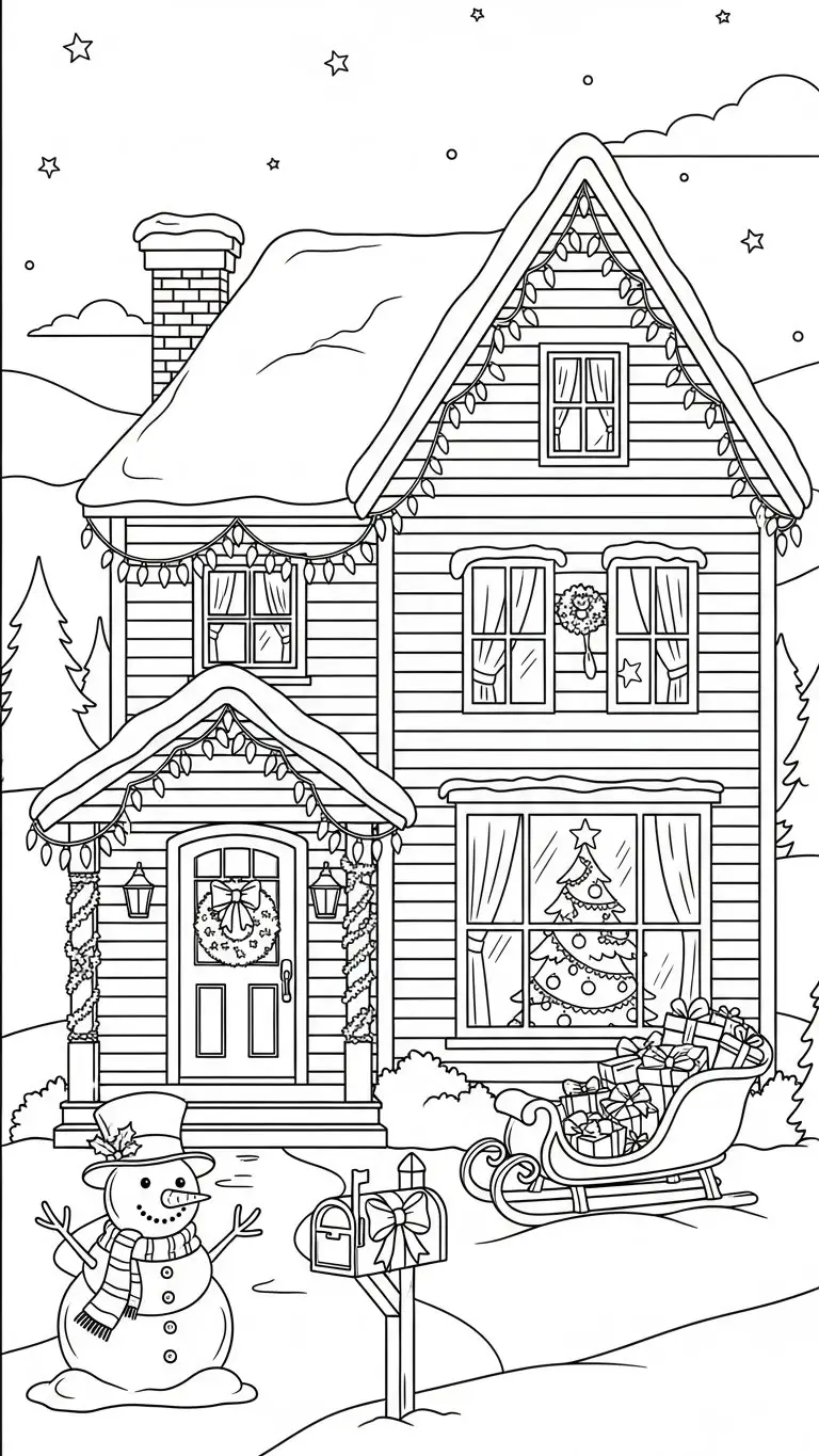 Desenho de uma casa com decoração natalina para colorir