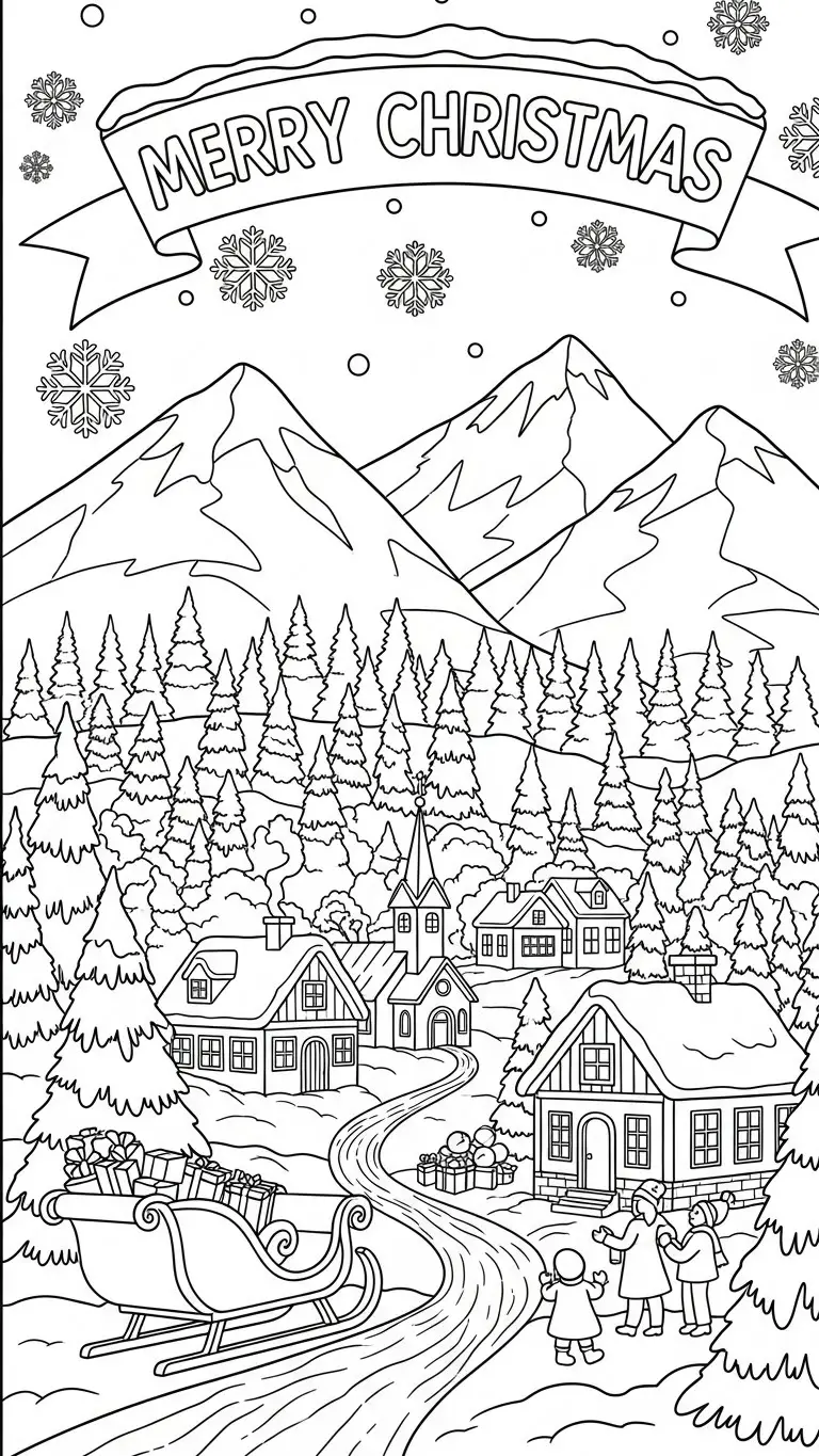 Desenho de cena de Natal no inverno com montanhas para colorir