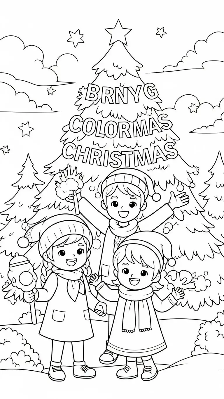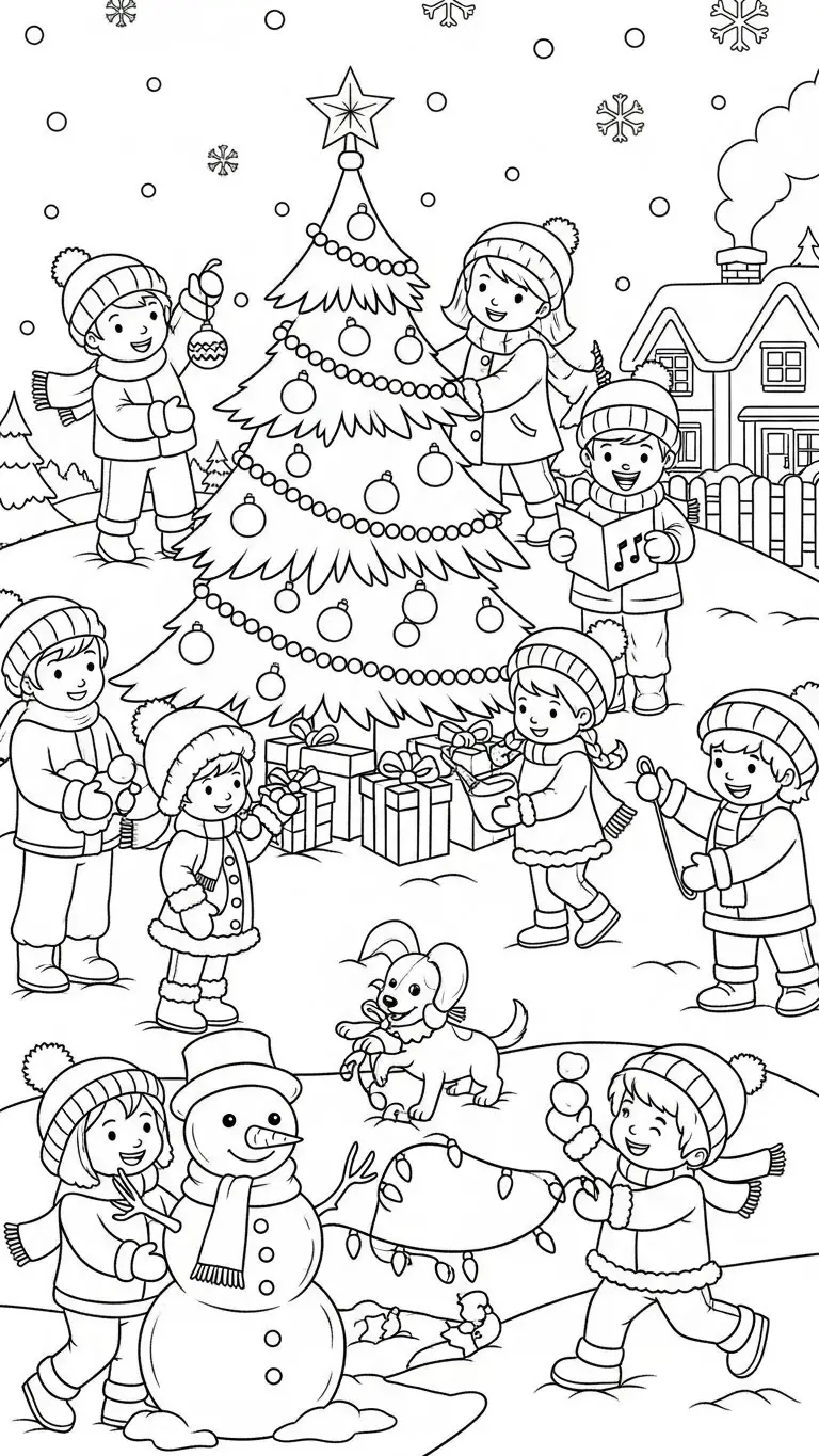 Desenho de cena natalina com crianças brincando para colorir
