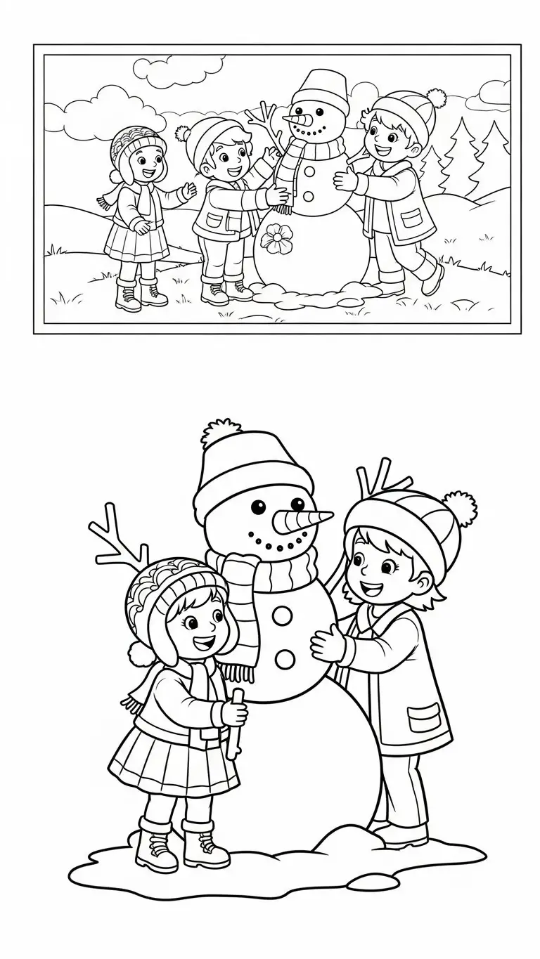 Desenho de crianças construindo boneco de neve para colorir