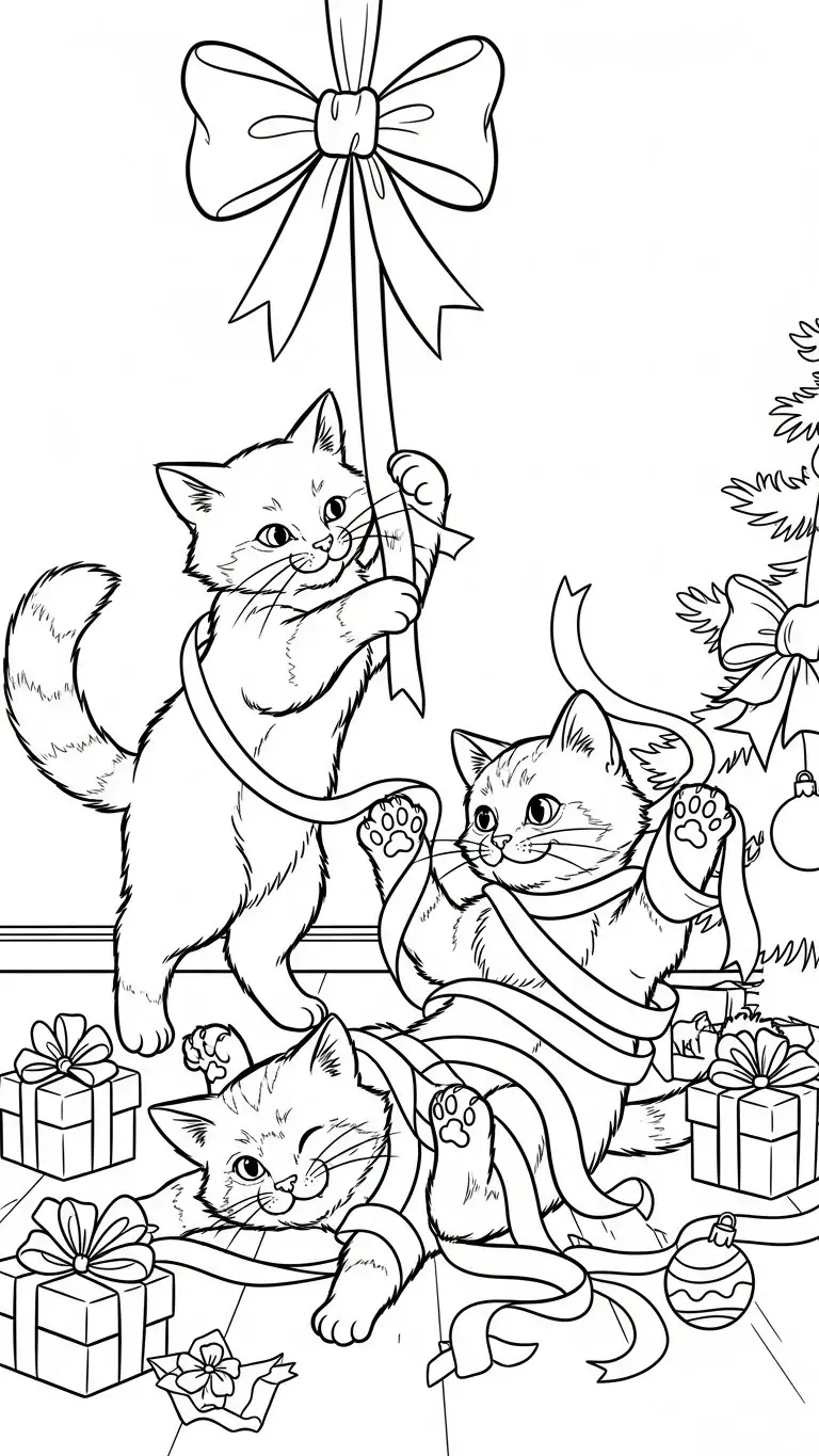Desenho de gatos brincando com fitas de Natal para colorir