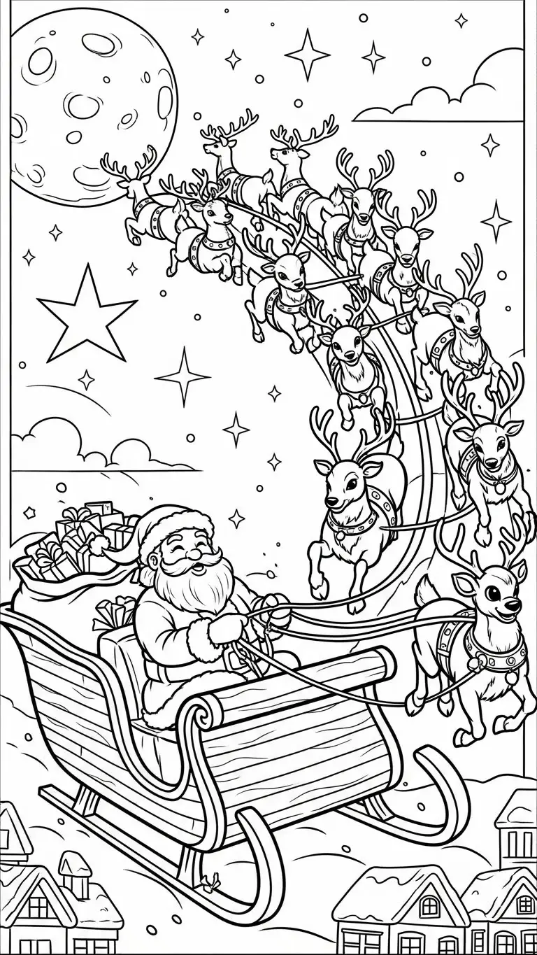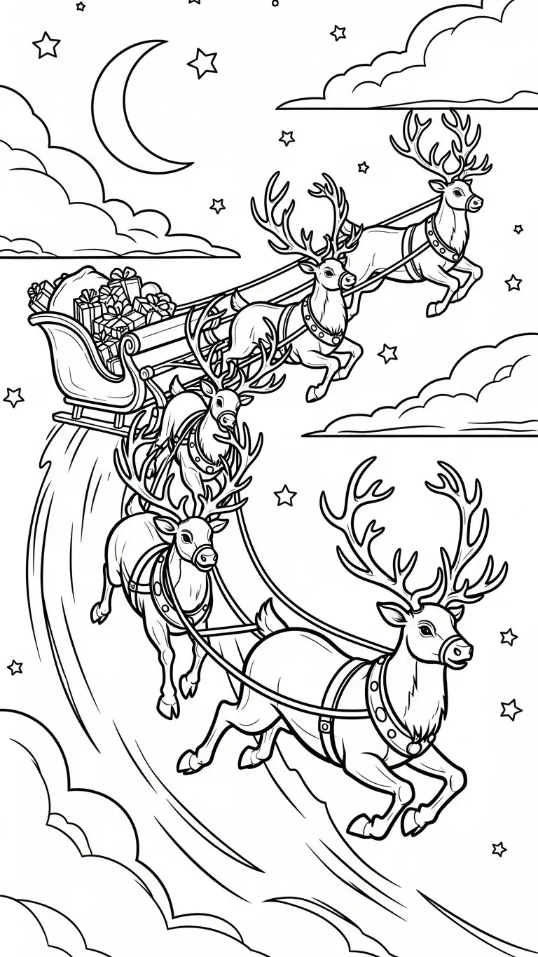 Desenho de renas voando no céu à noite para colorir