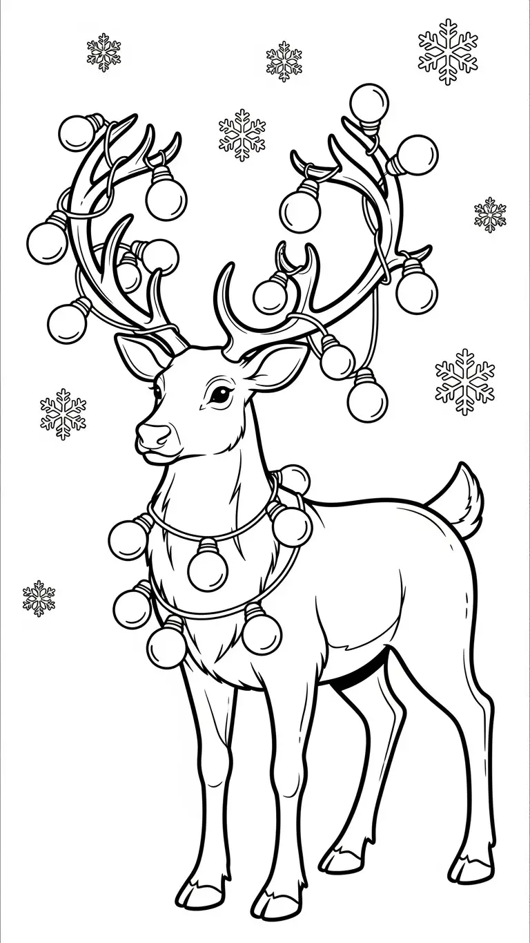 Desenho de rena com luzes de Natal para colorir