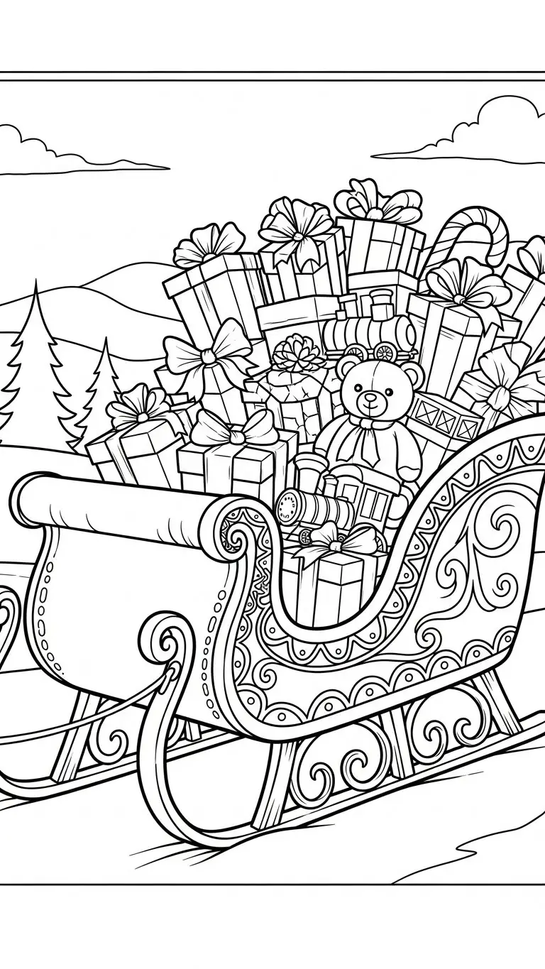 Desenho de trenó com presentes para colorir