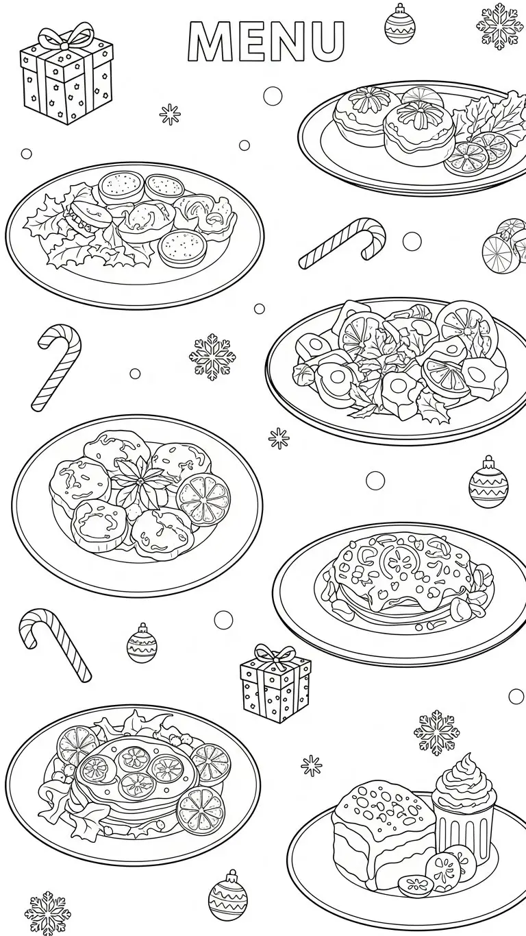 Desenho de um cardápio de Natal com pratos típicos para colorir