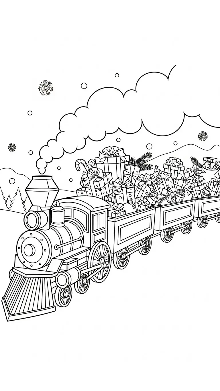 Desenho de um treno natalino com presentes para colorir