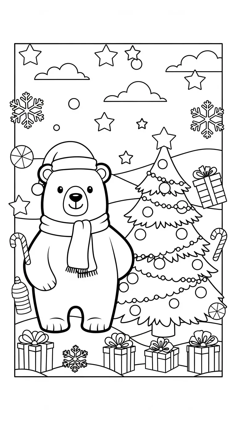Desenho de um urso polar em um cenário natalino para colorir