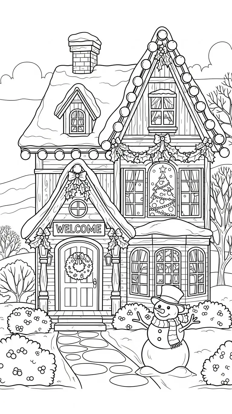 Desenho de casa decorada para o Natal para colorir
