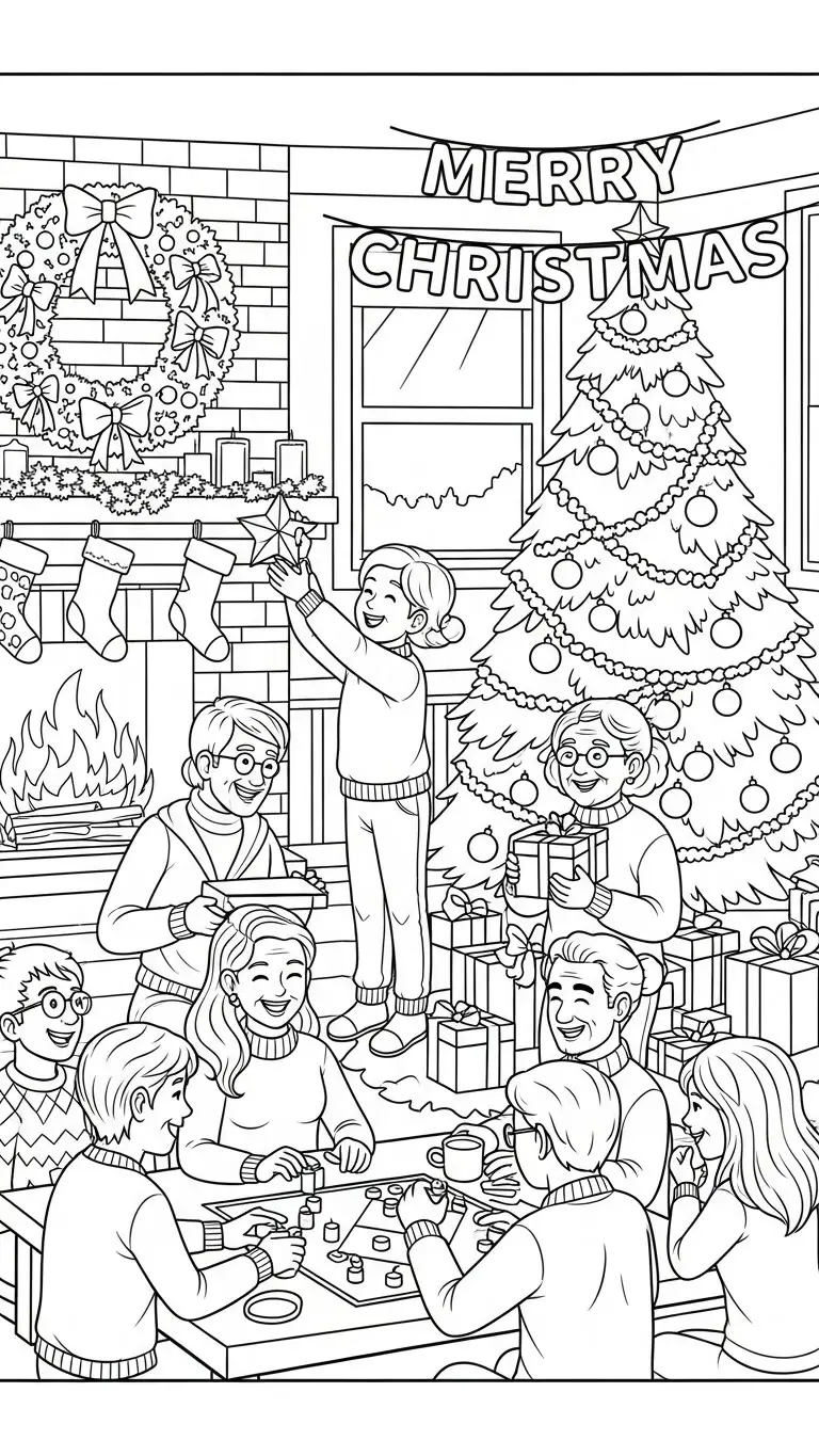 Desenho de uma festa de Natal com família para colorir