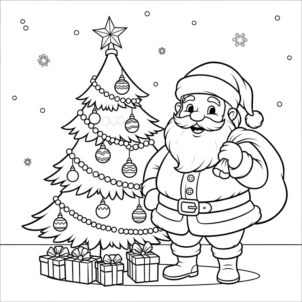 Desenho do Papai Noel com a árvore de Natal para colorir