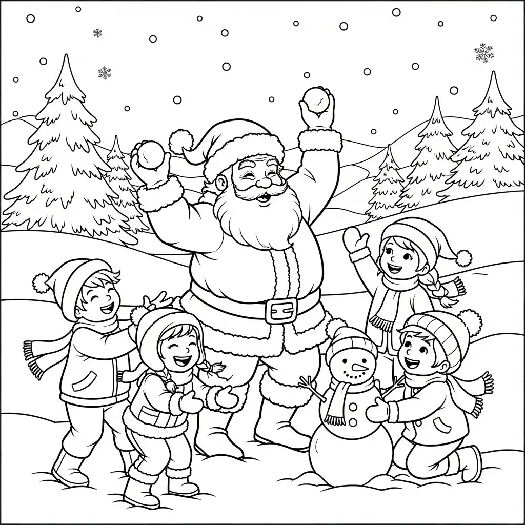 Desenho do Papai Noel com crianças brincando na neve para colorir