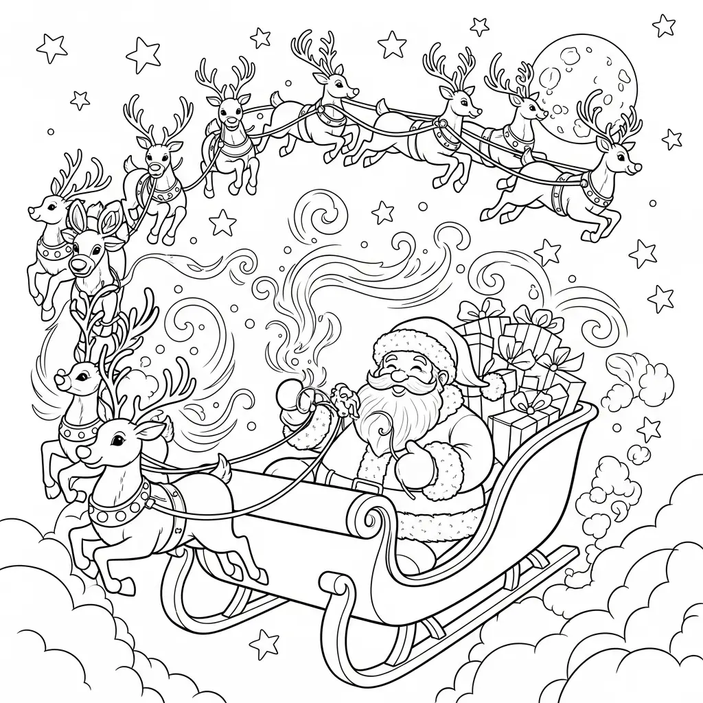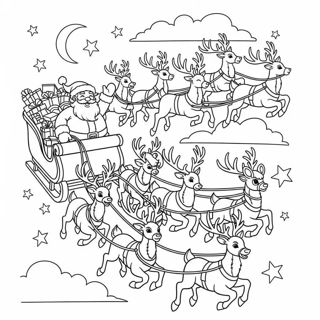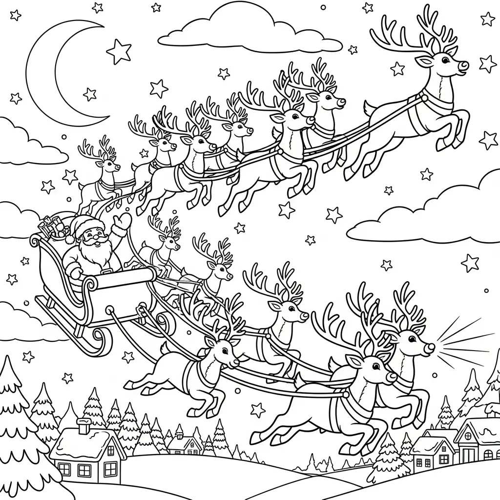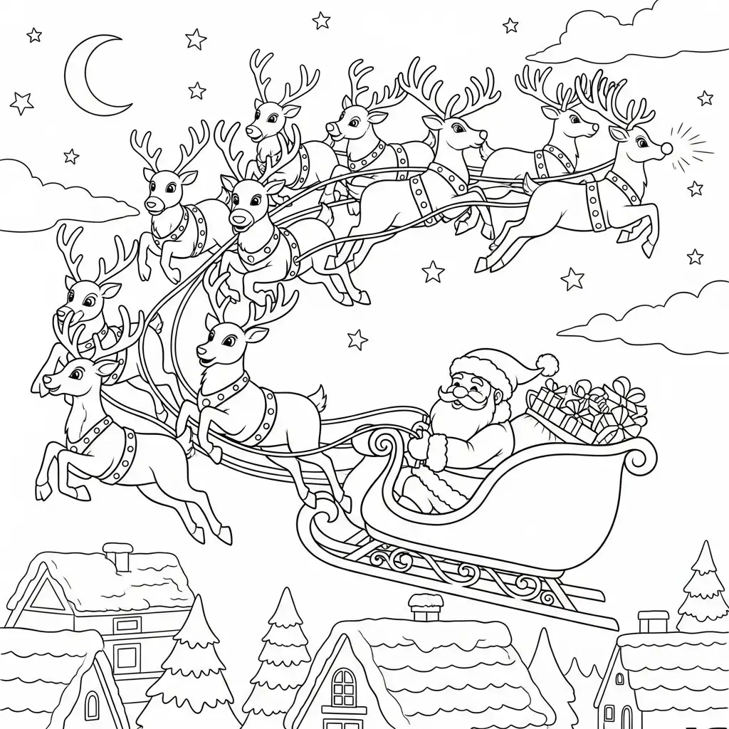 Desenho do Papai Noel e renas em uma noite estrelada para colorir