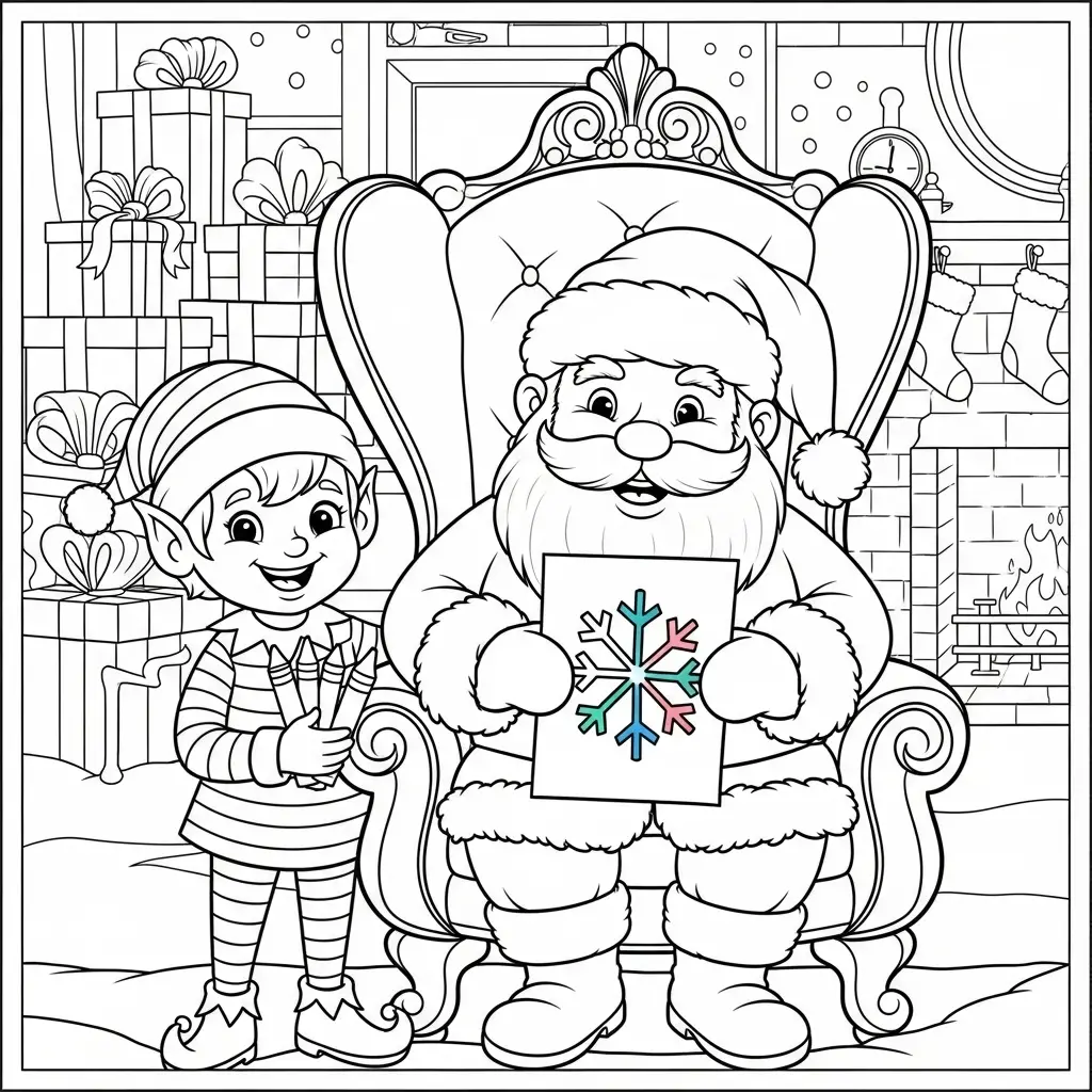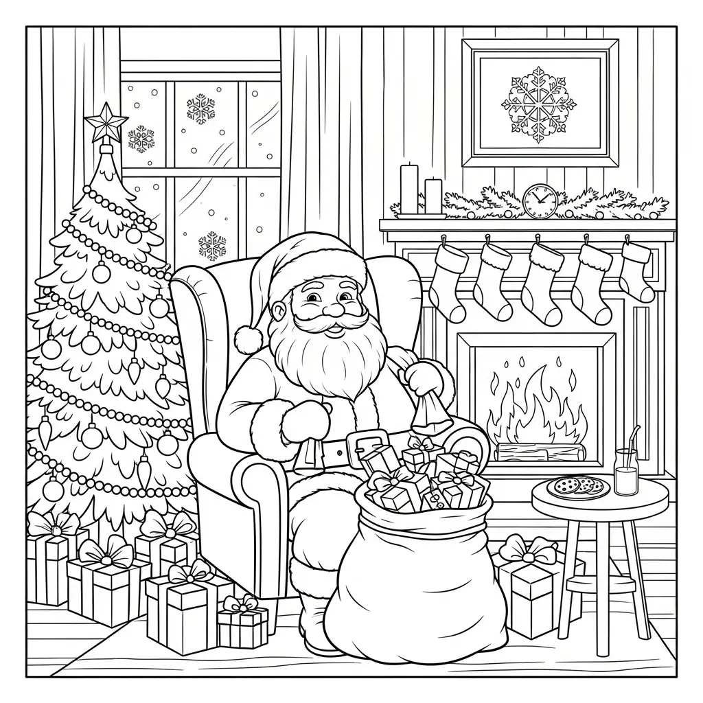 Desenho do Papai Noel tranquilo em sua oficina para colorir