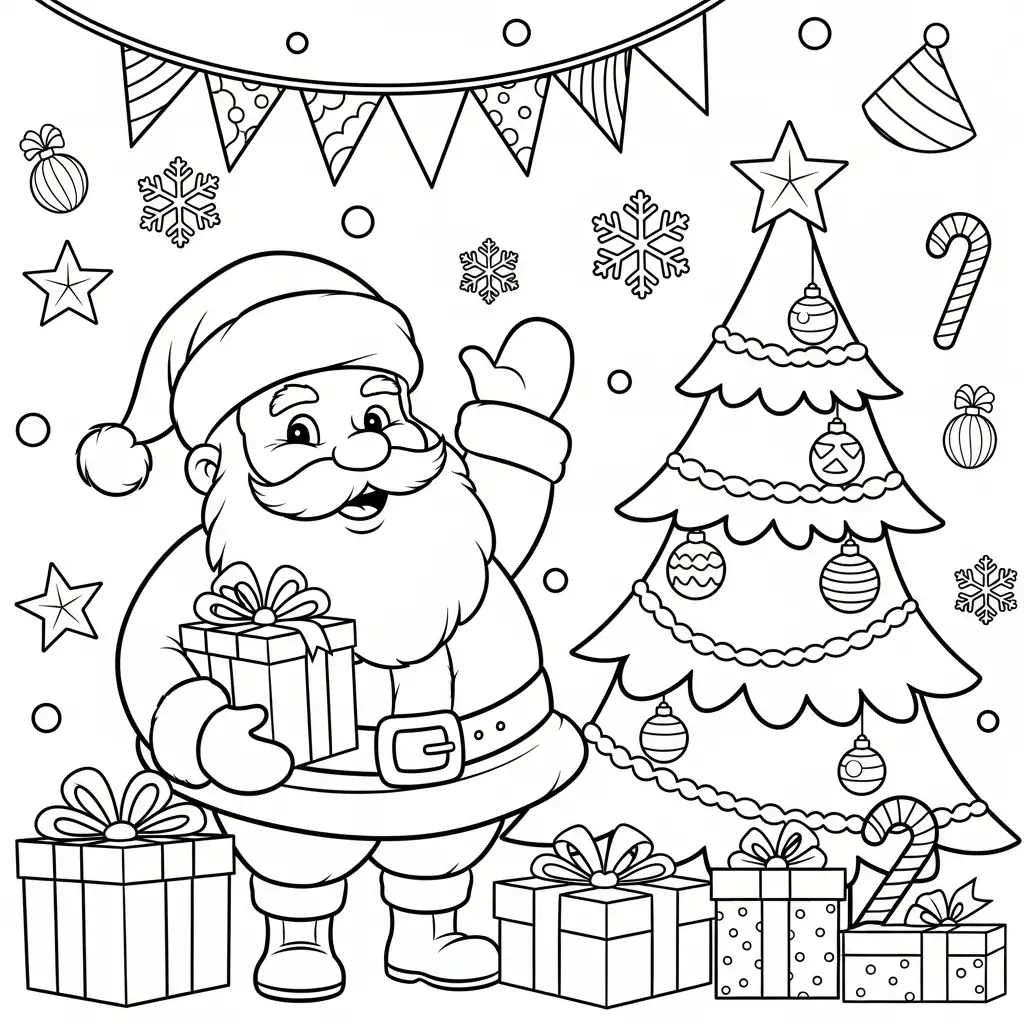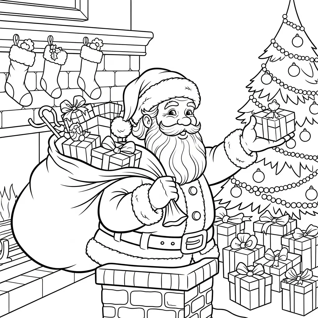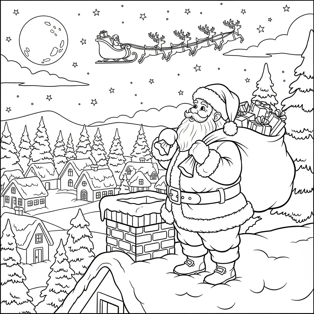 Desenho do Papai Noel em uma cena de Natal tradicional para colorir