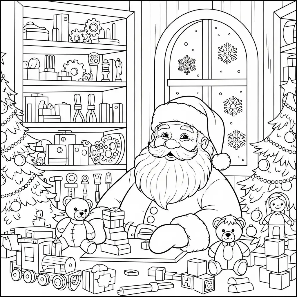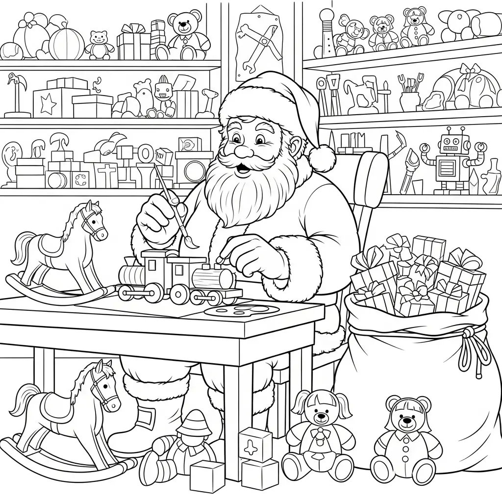 Desenho do Papai Noel em seu workshop de brinquedos para colorir
