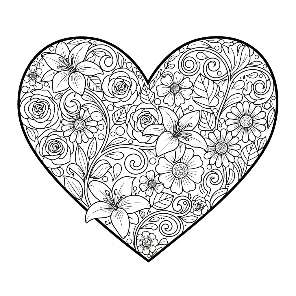 Desenho de Coração com Flores para colorir