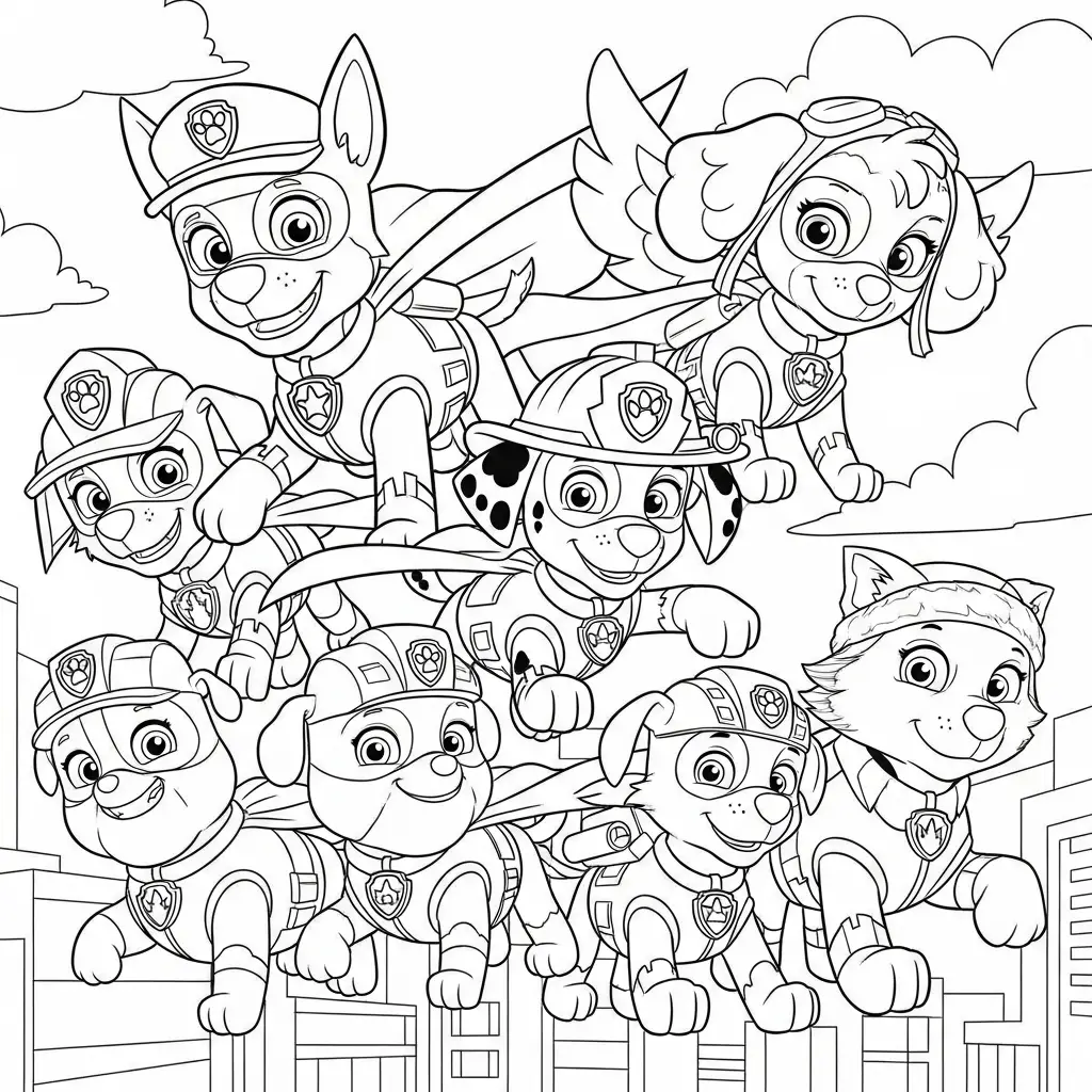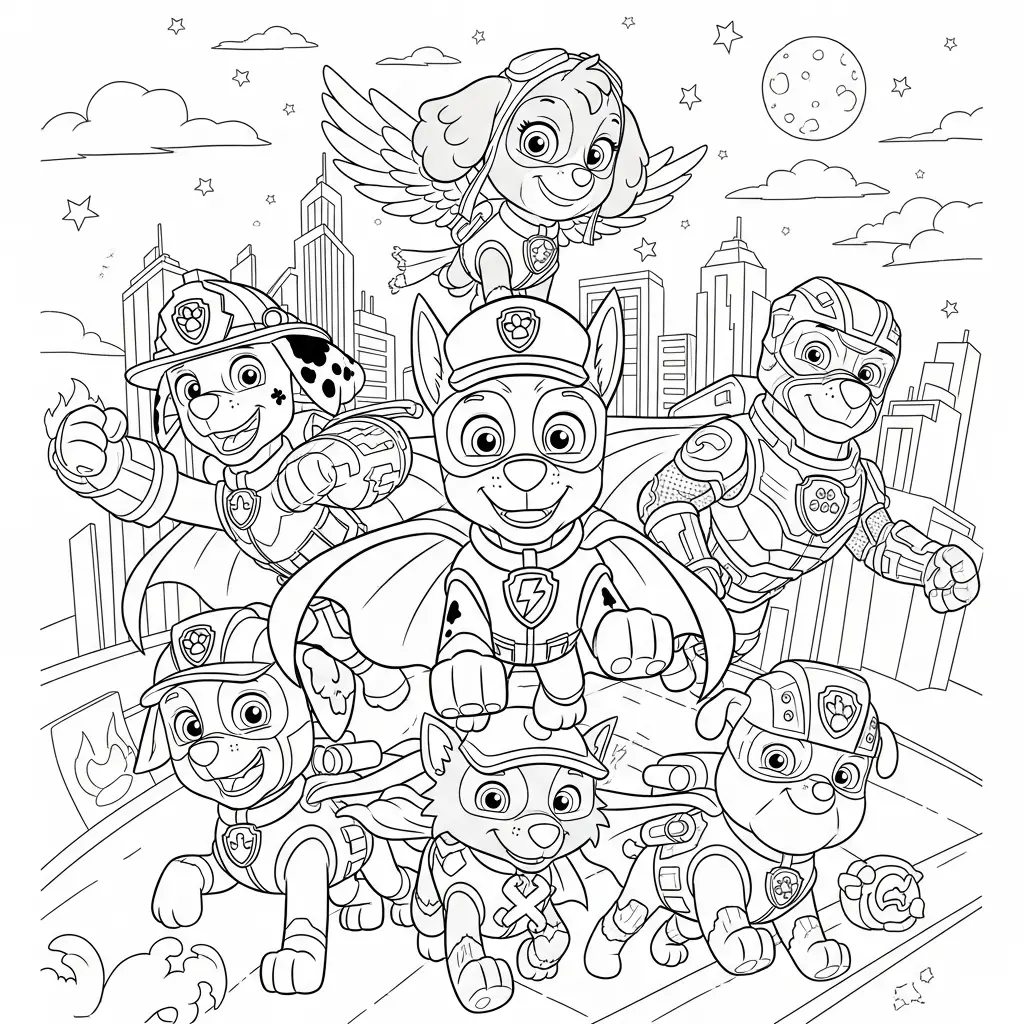 Desenho da Patrulha Canina com roupas de super-heróis para colorir