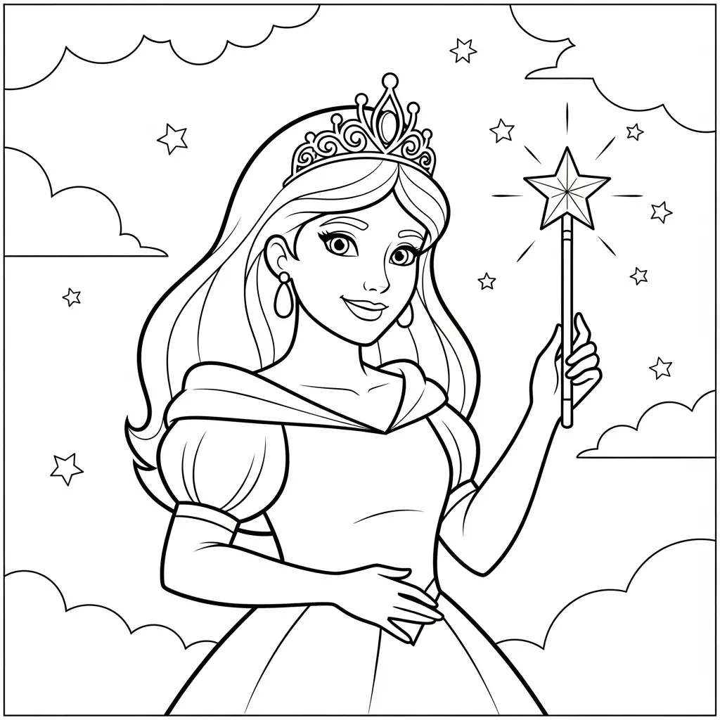 Desenho de Princesa com tiara e varinha mágica para colorir