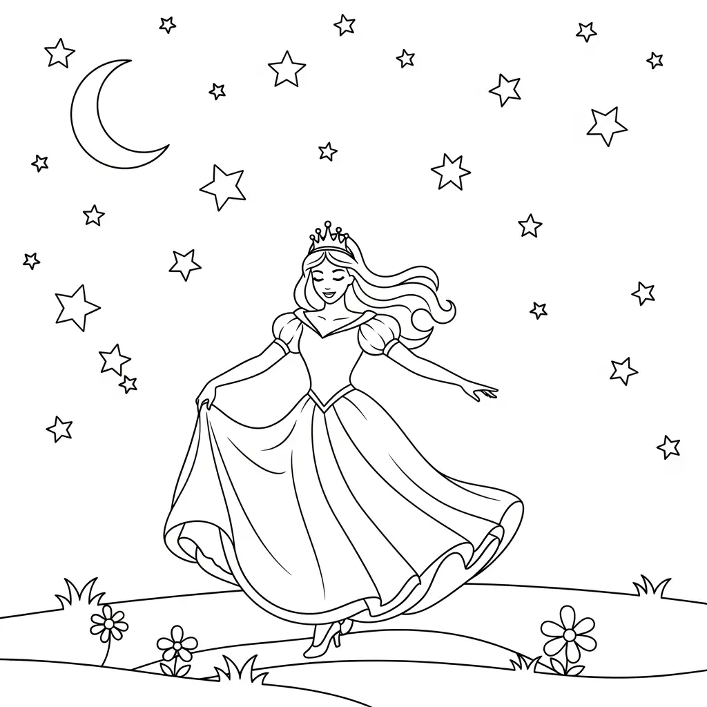 Desenho de Princesa dançando sob estrelas para colorir