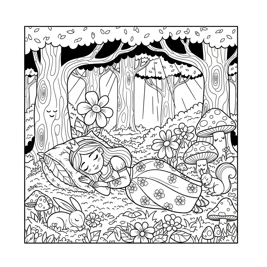 Desenho de Princesa dormindo na floresta para colorir