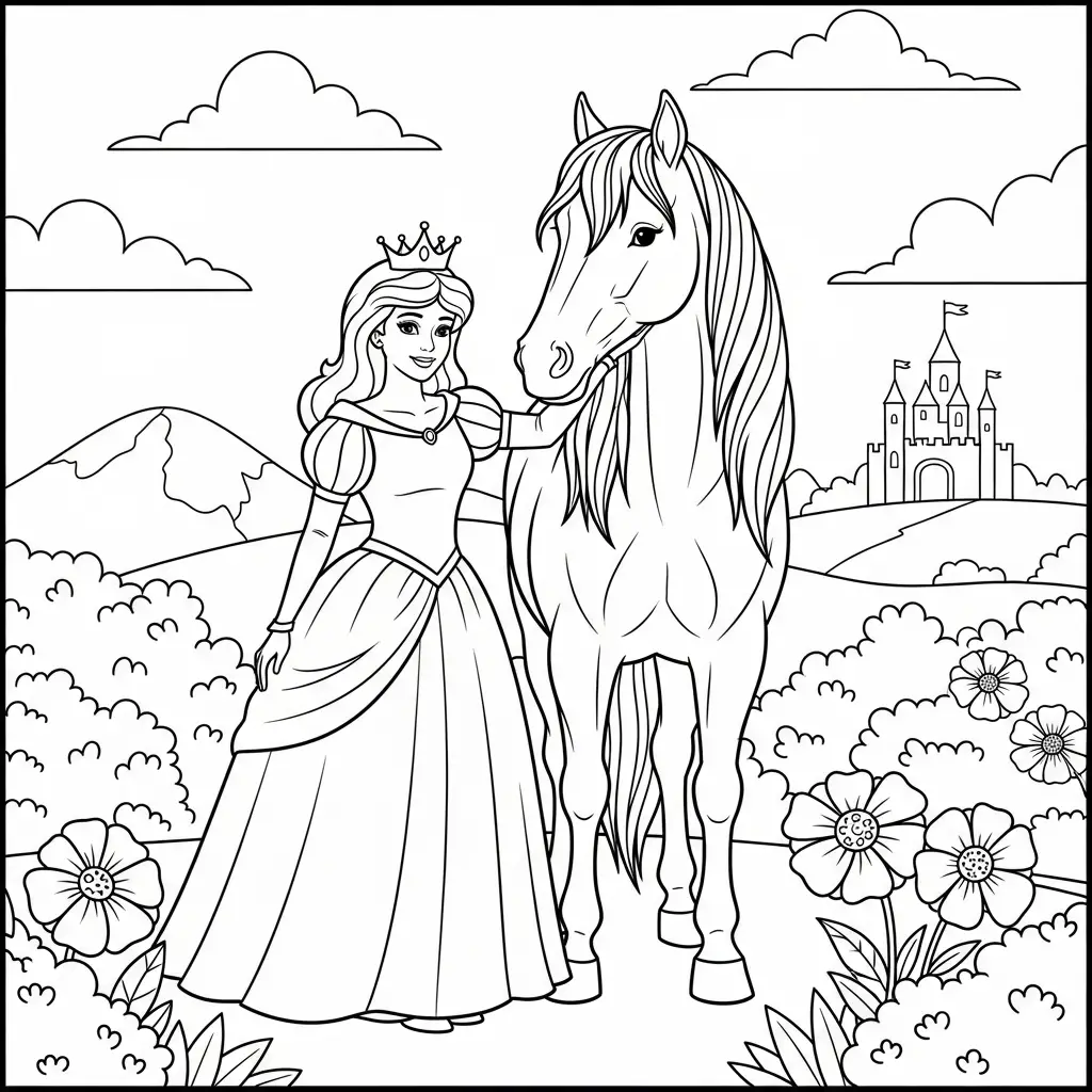 Desenho de Princesa e seu cavalo para colorir