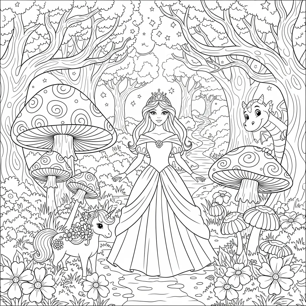 Desenho de Princesa em uma floresta mágica para colorir