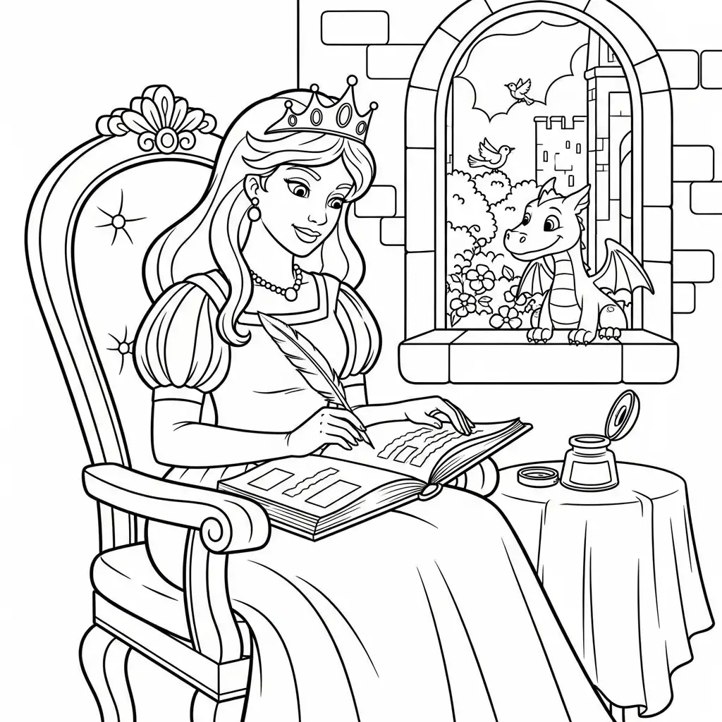 Desenho de Princesa escrevendo em um diário para colorir