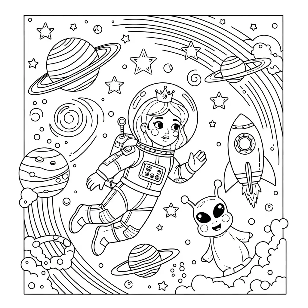 Desenho de Princesa explorando o espaço para colorir