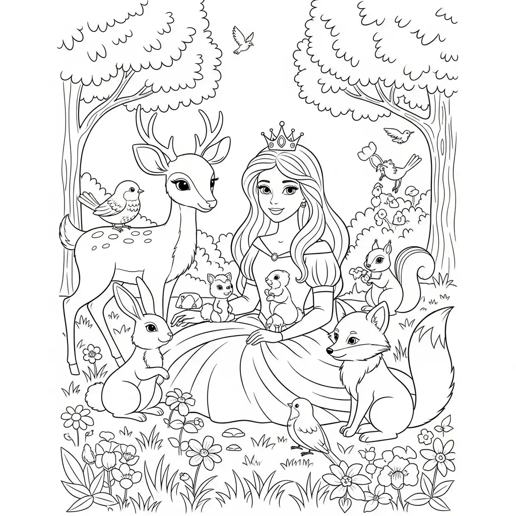 Desenho de Princesa com amigos animais para colorir