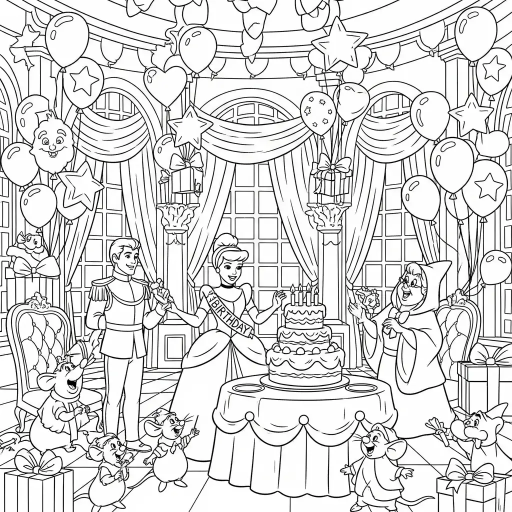 Desenho colorido da festa de aniversário da Cinderela para colorir