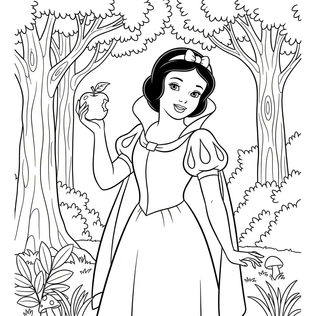 Desenho da Branca de Neve com maçãs para colorir