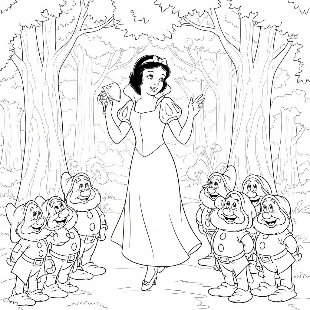 Desenho da Branca de Neve com os Sete Anões para colorir