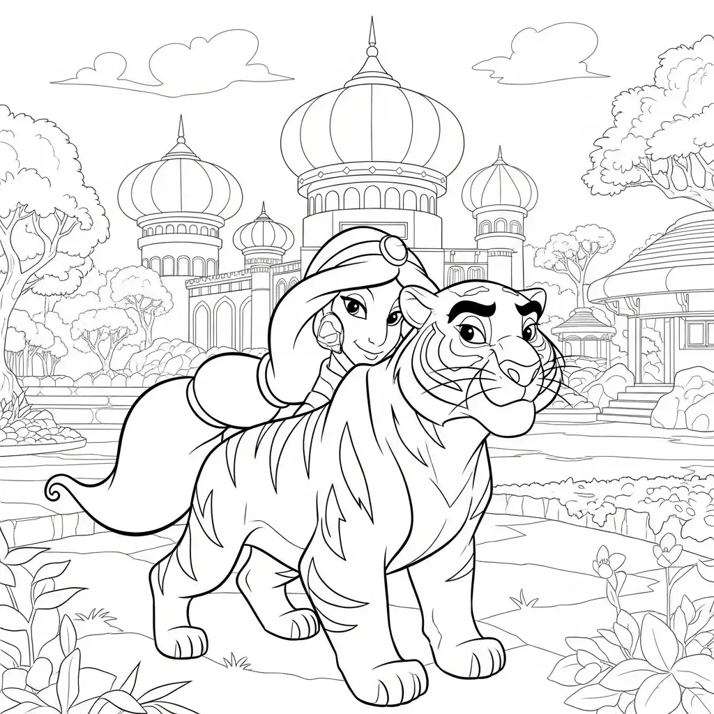 Desenho da Jasmine com seu tigre Rajah para colorir