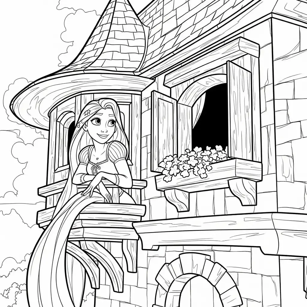 Desenho da princesa Rapunzel em sua torre para colorir