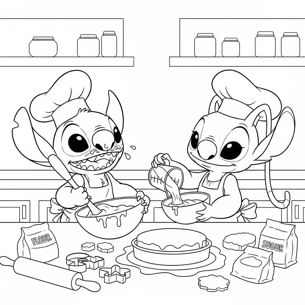 Desenho do Stitch e Angel fazendo um bolo para colorir