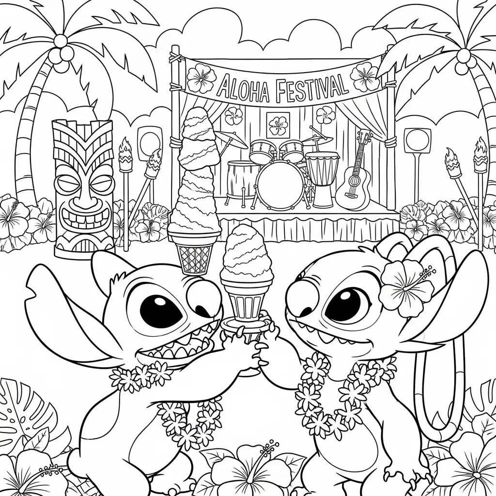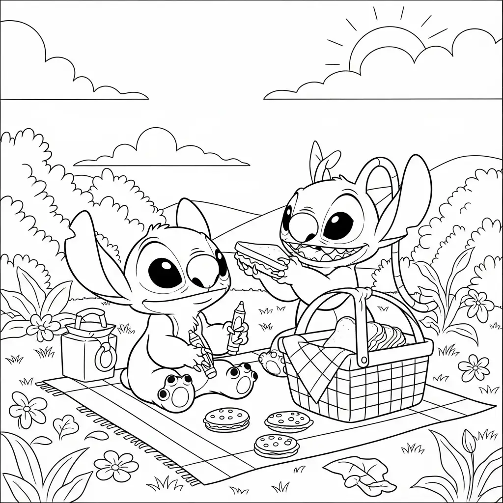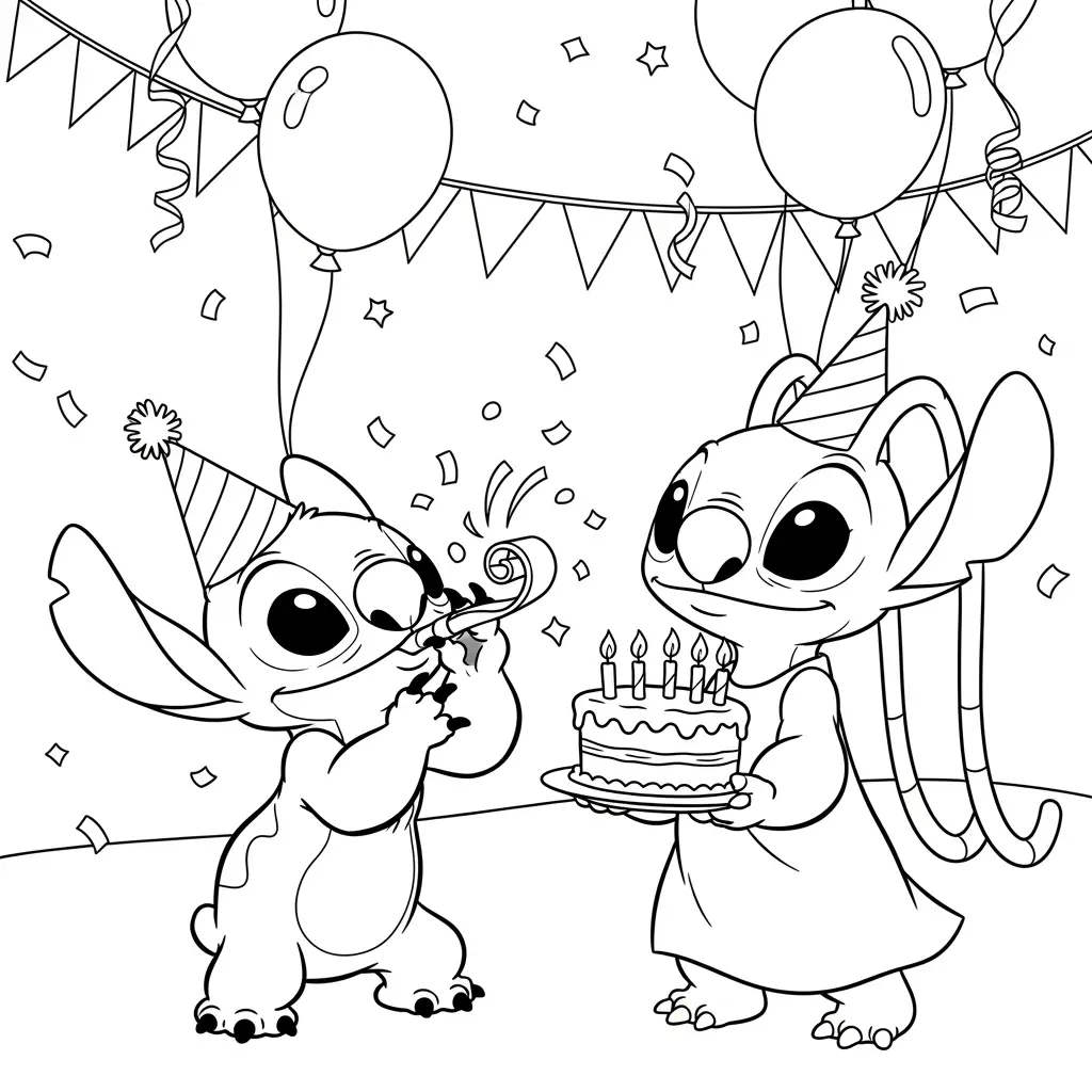 Desenho do Stitch e Angel em uma festa de aniversário para colorir